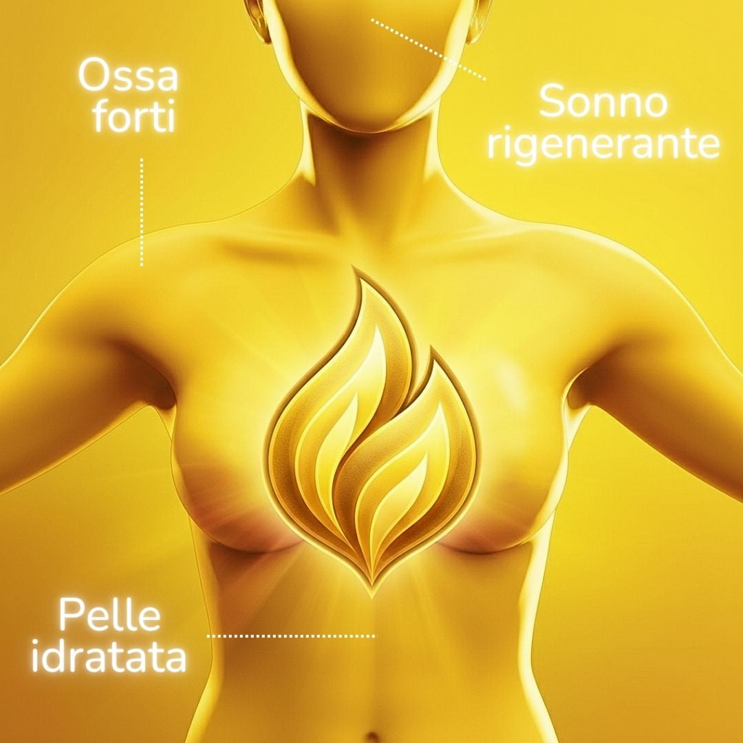 Una formula studiata per supportare il corpo femminile attraverso i cambiamenti metabolici e ormonali. La Creatina favorisce l'idratazione intracellulare (dentro la cellula, non sottocutanea), sostenendo la tonicità dei tessuti e la compattezza della pelle senza causare ritenzione idrica indesiderata. Il Magnesio Bisglicinato ad alto assorbimento è un cofattore essenziale per la salute ossea e agisce sul rilassamento del sistema nervoso, promuovendo un sonno rigenerante anche dopo la menopausa.